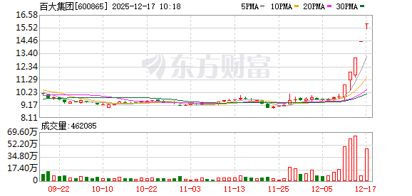 百大集团盘中涨停,已连收5个涨停板,截至9:29,该股报15.82元,换手率0.22%,成交量82.33万股,成交金额1302.39万元,涨停板封单金额为6.70亿元。连续涨停期间,该股累计上涨61.10%,累计换手率为48.59%。最新A股总市值达59.52亿元。