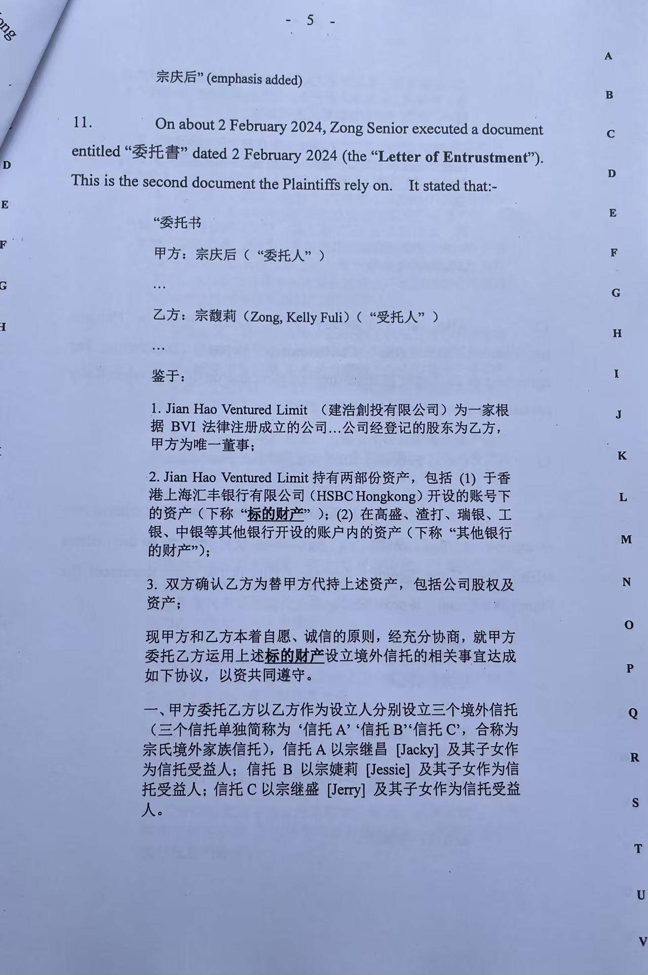 同在2024年2月2日,宗庆后签署了一份委托书,确认宗馥莉替宗庆后代持建浩公司股权及资产,包括于香港上海汇丰银行有限公司开设账号下的资产(即本次诉讼的标的资产),以及在其他银行的财产。