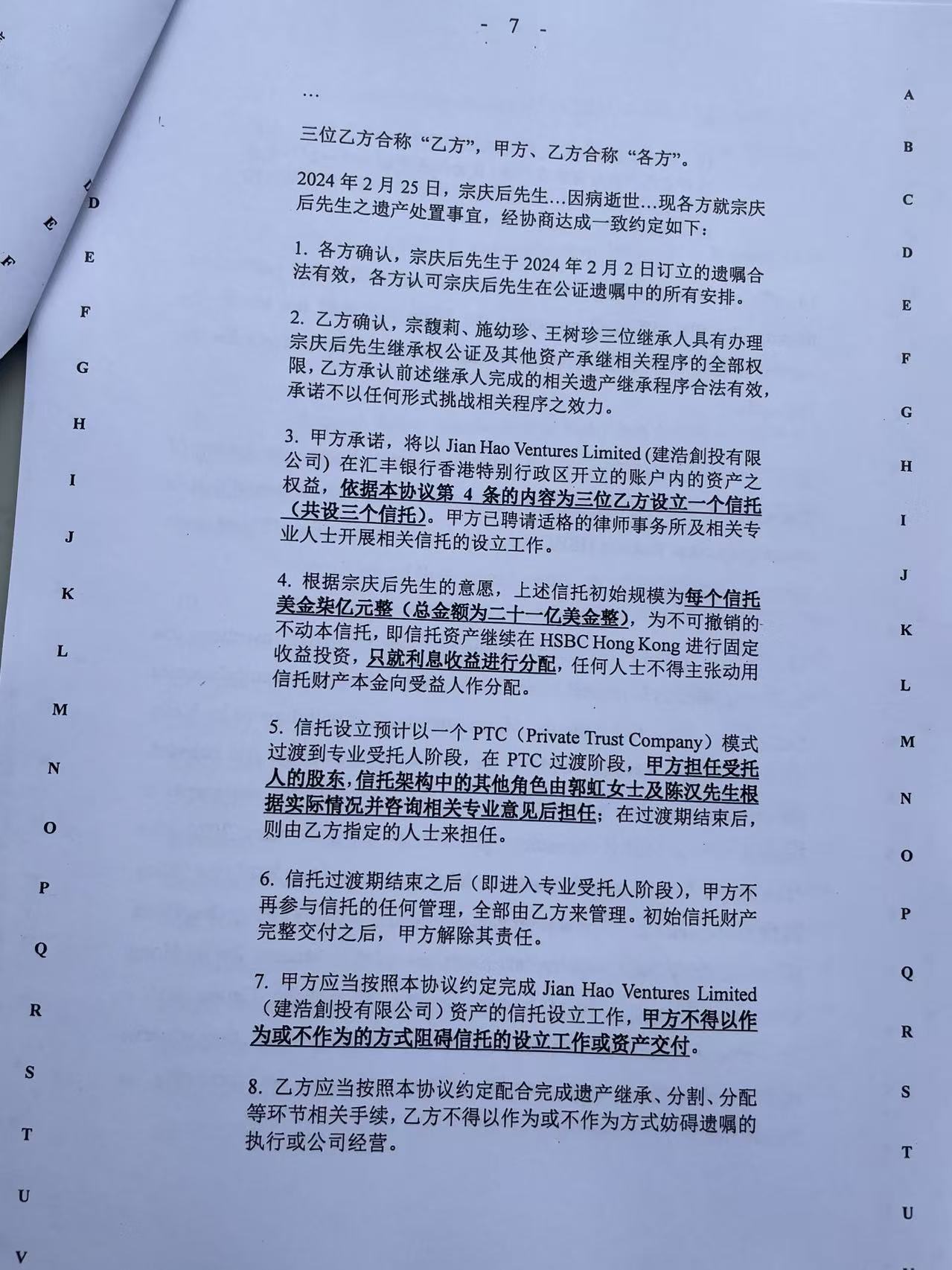 4、2024年3月14日,宗馥莉与宗继昌、宗婕莉、宗继盛三人就宗庆后去世引发的事宜订立了一份名为《协议》的文件。