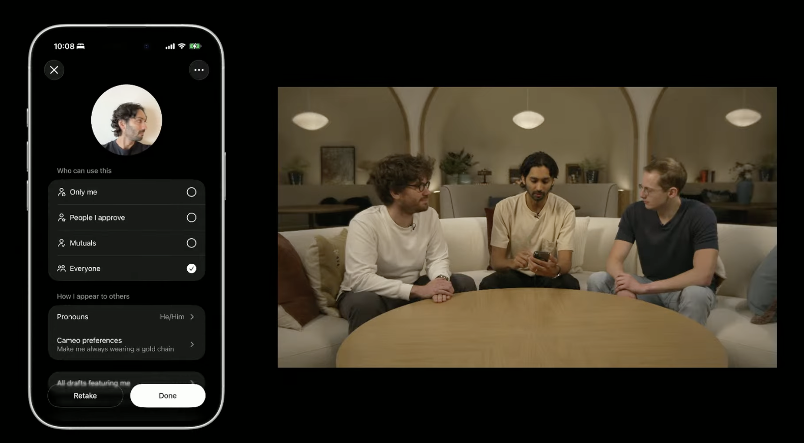 在应用中,用户可以创作、混录彼此的创作风格,在可自定义的Sora动态中发现新视频,并通过“客串(Cameos)”功能将自己或好友引入到视频中。使用客串功能,用户只需在应用中进行一次简短的音视频录制,即可以惊人的保真度将自己直接带入任何Sora场景。