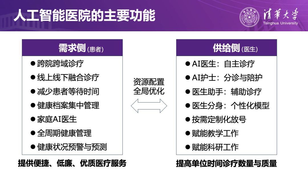 在实践层面,人工智能医院已经形成了较为清晰的应用愿景:面向患者,它支持跨院跨域诊疗、线上线下融合问诊、健康管理与风险预测;面向医护人员,它提供自主问诊、智能分诊、辅助诊疗、个性化模型等能力,帮助提升单个医生的诊疗数量与质量,实现医疗资源的全局优化配置。