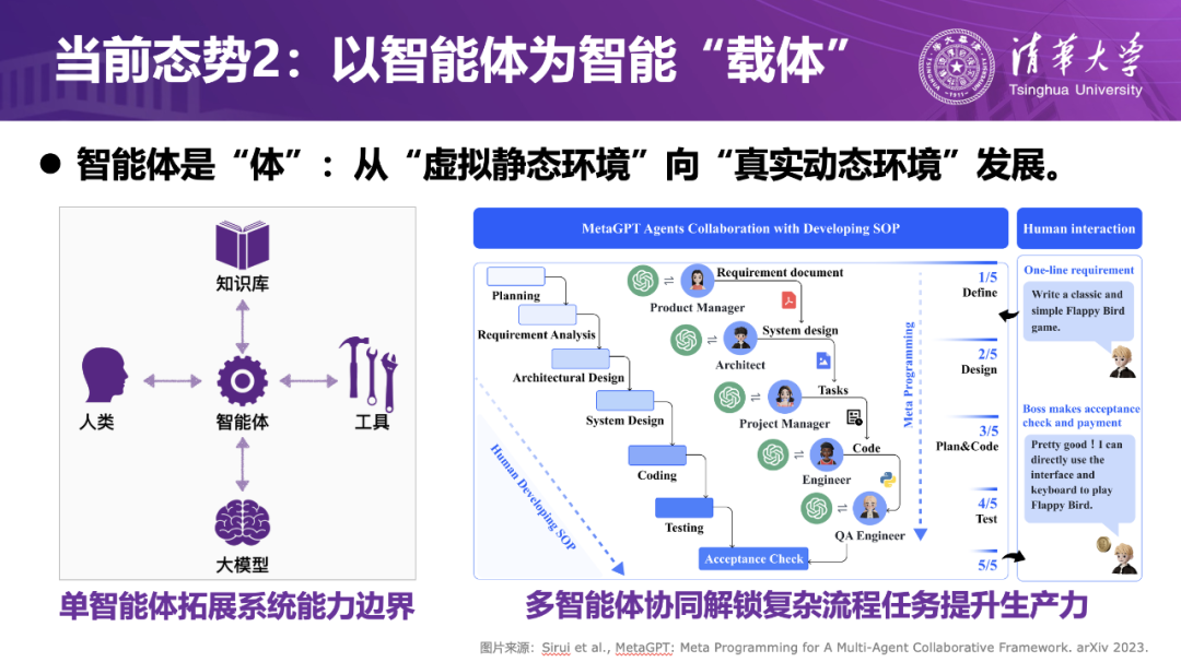 刘洋教授首先回顾了自 2022 年底 ChatGPT 问世以来大模型技术的快速演进:大模型能力迭代几乎以“加倍”的速度在推进——过去需要二三十年才能完成的积累,现在往往在几年甚至几个月内就能实现。伴随这股浪潮,人工智能正在形成两个愈发清晰的技术态势:大模型成为智能系统的“灵魂”,智能体成为智能落地的“载体”。