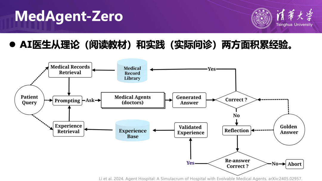 团队在虚拟空间里构建了一座流程完整的数字医院:患者从发病、分诊、挂号、问诊、检查到康复,形成一个闭环;医院涵盖二十多个科室、上千种疾病,既有带人设的 AI 患者,也有依据不同指南训练出的多类 AI 医生;时间在虚拟世界中被大幅加速,AI 医生可以在“虚拟两年”(现实一两天)的时间里看上万名病人,在成功与失败中持续积累经验并不断演化。